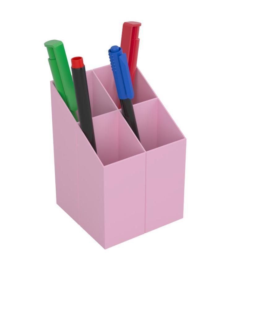 Stojánek na psací potřeby z pevného plastu 4 stejně velké přihrádky Rozměry: 7,5 x 11 x 7,5 cm Pastelové růžová barva Prodejní jednotka: 1 ks