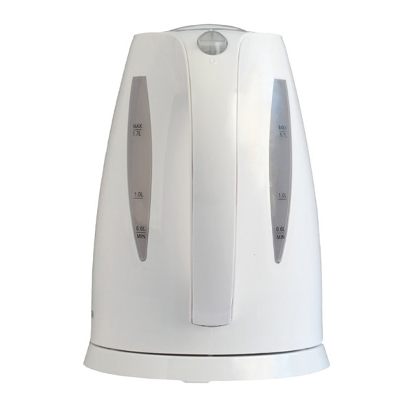 Plastová konvice, objem vody max. 1,7 l, příkon max. 2000W, ochrana před ohřevem bez vody, automatické vypnutí, síťová šňůra uložitelná v podstavci, barva bílá.