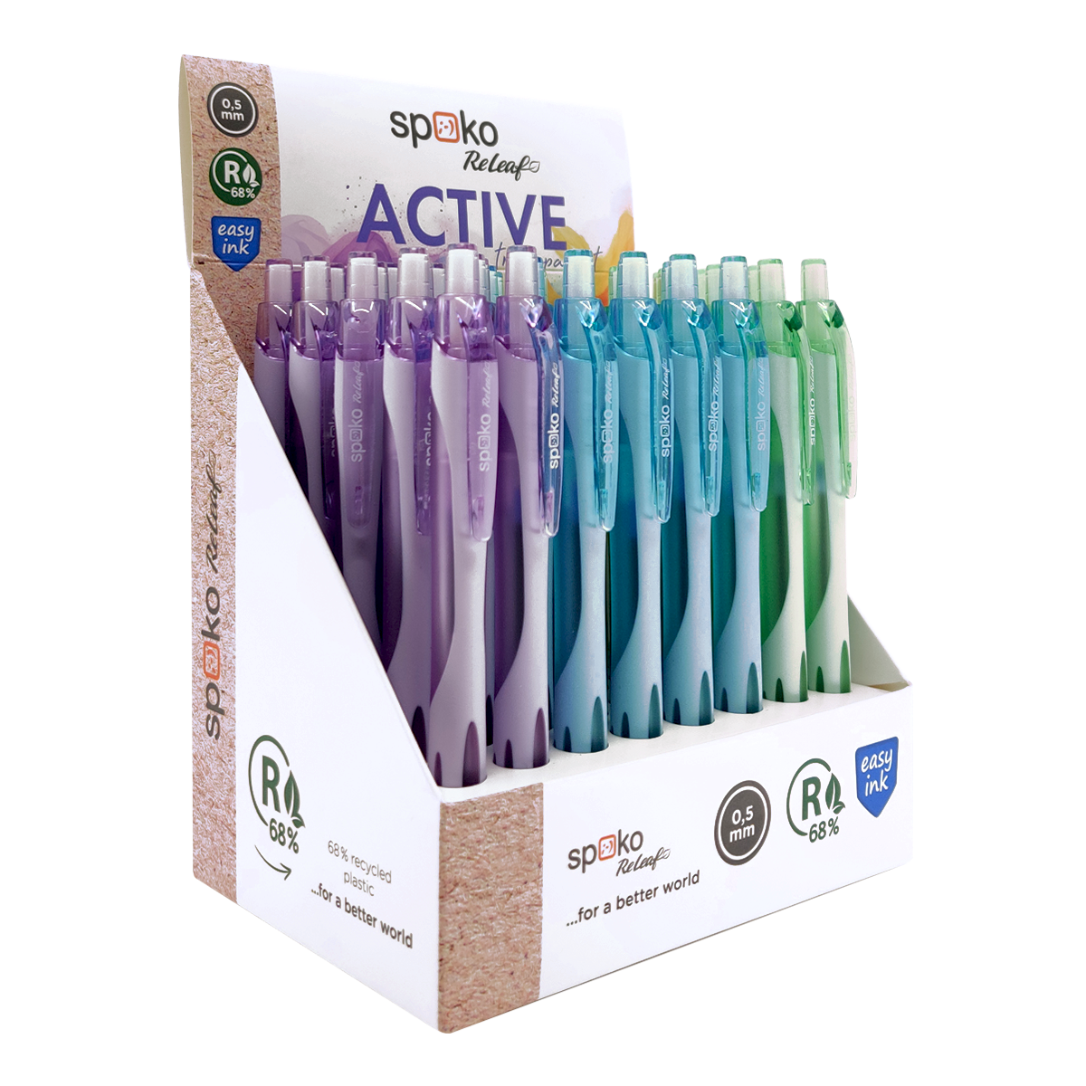Spoko ReLeaf je nová řada produktů značky Spoko, která přistupuje zodpovědně k životnímu prostředí a při výrobě svých produktů využívá převážně recyklované materiály. Jednotný design balení usnadňuje identifikaci produktů Spoko ReLeaf mezi ostatními výrobky Spoko. Nový design kuličkového pera Active v pastelových barvách. Tělo pera v kombinaci barev matné a průhledné pro lepší kontrolu náplně. Transparentní stiskací mechanika v barvě pera. Jedinečná náplň Easy Ink – inkoust s nízkou viskozitou pro pohodlnější a plynulejší psaní. Tenký hrot s modrou náplní Needle Tip. Tištěné logo na klipu. Vyrobeno ze 68 % recyklovaného plastu. šířka stopy: 0,5 mm modrá náplň materiál: 68 % recyklovaný plast náhradní náplň S0297 mix pastelových barev: fialová, modrá, zelená balení: 40 ks/displej