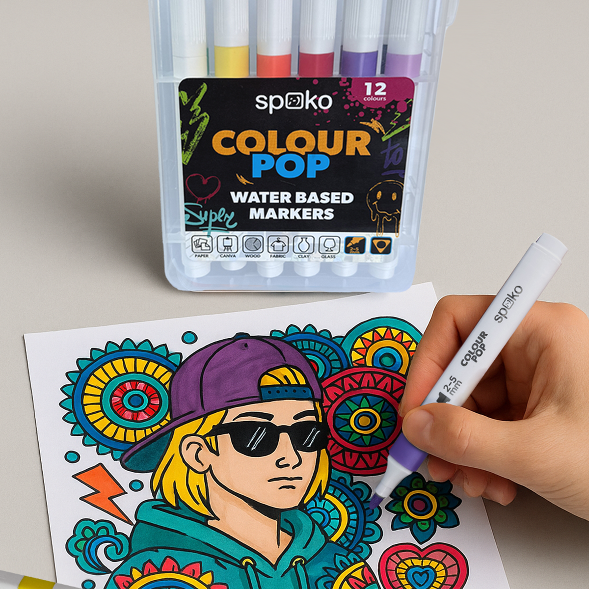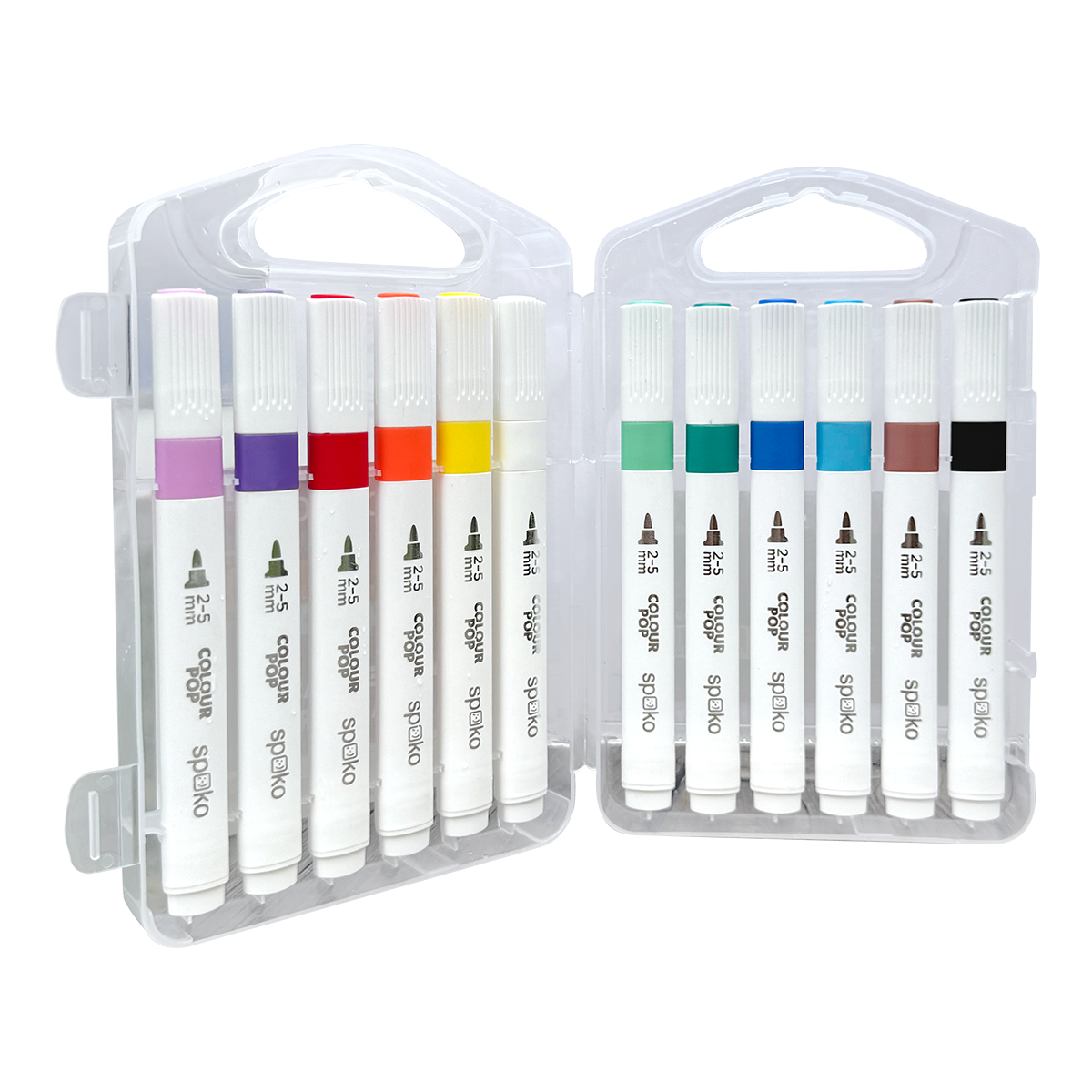 Buď Spoko, buď COLOUR POP! Sada rychleschnoucích popisovačů se složením na vodní bázi. Kulatý střední hrot, který je univerzální a trojhranný tvar pro pohodlný úchop. Odvětrávané víčko, 12 výrazných barev, vhodné na mnoho povrchů – od kamínků, přes canva plátno, textilní materiály, dřevo nebo obyčejný papír. Praktický box - kufřík pro snadné přenášení.