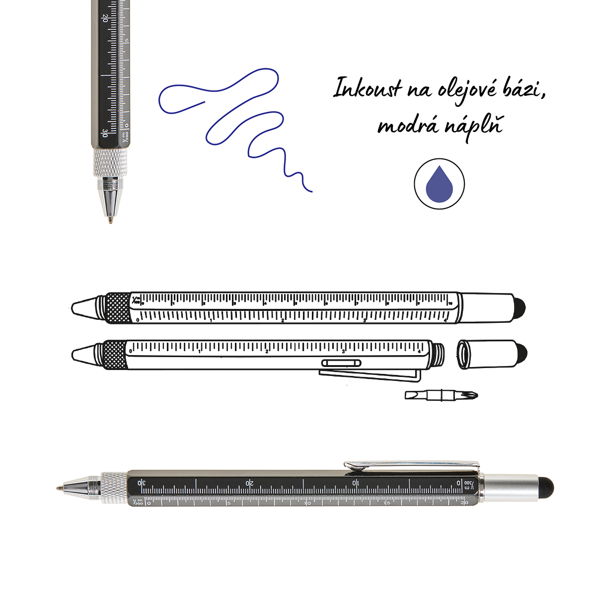 Multifunkční kuličkové pero spojuje elegantní psací nástroj s pěti užitečnými funkcemi, které využijete doma, v kanceláři i na cestách. Skvělé vychytávky, které máte vždy po ruce. Kromě kuličkového pera obsahuje pravítko v centimetrech i palcích, vodováhu, plochý a křížový šroubovák a dotykový stylus pro smartphony a tablety. Modrá náplň, inkoust na olejové bázi, který hladce klouže po papíru.