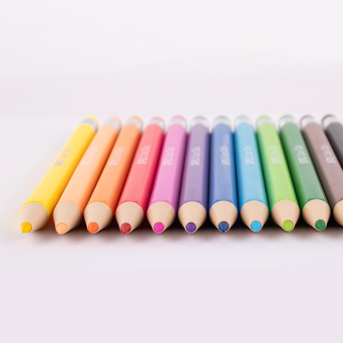 Vysouvací pastelky, které jen tak něco nezničí. Odolné plastové tělo chrání hrot tuhy před poškozením. Pomocí stiskací mechaniky v koncovce se vysouvá tuha ven. Vysoký obsah pigmentů zajistí krásné a syté odstíny každému výkresu. Číselné značení barev na koncovkách pastelek pro lepší identifikaci odstínu. Uzavíratelná tuba slouží zároveň jako penál. Balení obsahuje 12 náhradních tuh a ořezávátko s kontejnerem. obsah sady: 12 pastelek, 12 náhradních tuh, ořezávátko s kontejnerem, plastový tubus – penál šířka stopy: 2,6 mm jasné a syté barvy stiskací mechanika pro vysunutí tuhy odolné plastové tělo obsah balení: 12 ks
