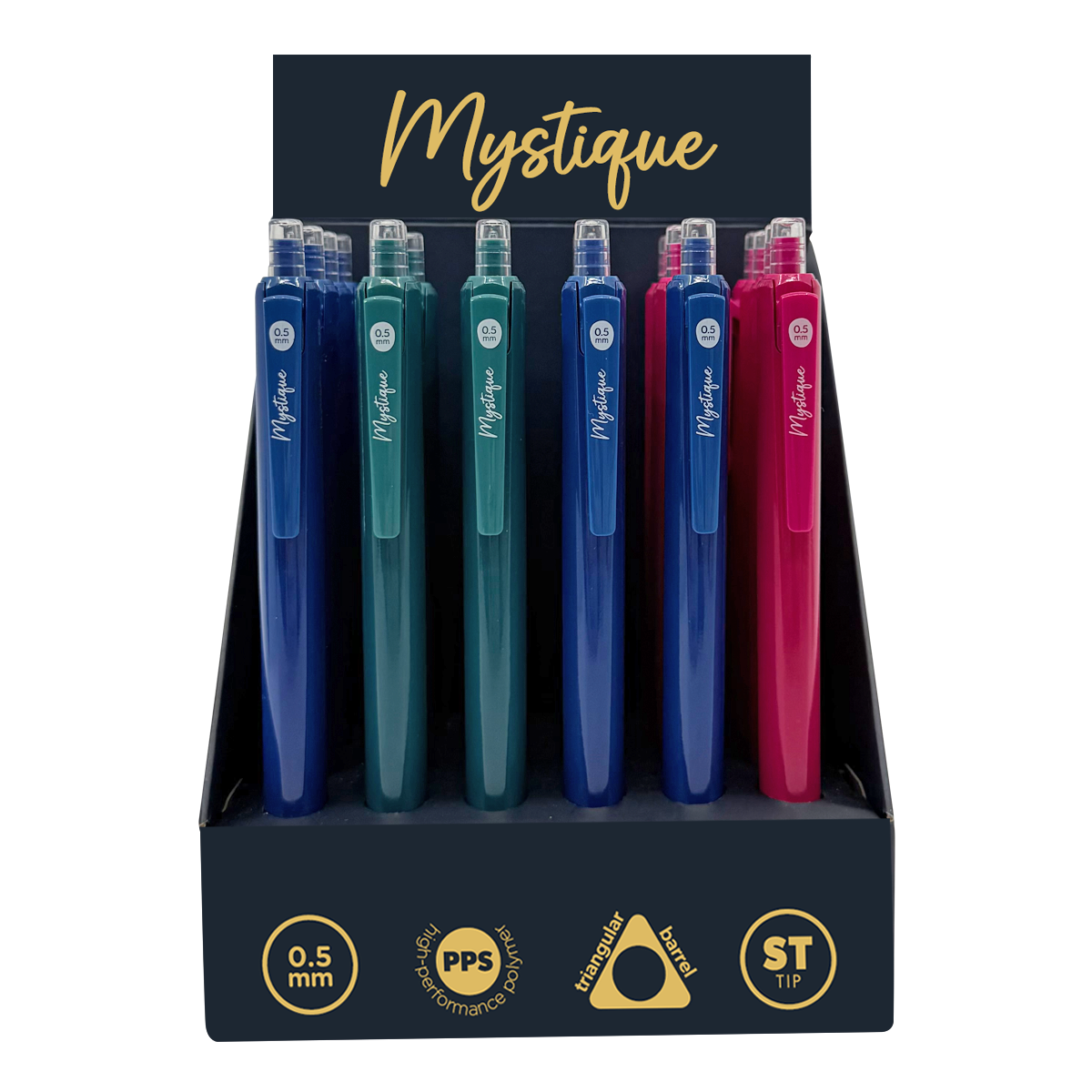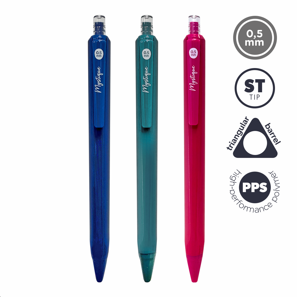 Luxusní gelový roller s lesklou povrchovou úpravou a výrazným barevným akcentem. Robustní a odolné tělo, vyrobené z vysoce kvalitního technického polymeru, vyniká pevností, dlouhodobou životností a minimální mírou opotřebení (např. poškrábání), a to i při každodenním použití. Výsledkem je dlouhodobě perfektní vzhled pera. Lesklá povrchová úprava. Ergonomický trojhranný tvar zaručí pohodlný a stabilní úchop. Barevně sladěný plastový klip, stiskací mechanika doplněná o transparentní krytku. Velkokapacitní gelová náplň s jedinečně tenkým a odolným „ST“ hrotem zajišťuje plynulé psaní a konstantní, jasnou stopu. šířka stopy: 0,5 mm modrá náplň materiál: vysoce odolný technický polymer (PPS) náhradní náplň: S0291 mix barev: tm. modrá, růžová, modro-zelená ST Tip – odolný a tenký hrot pro rychlé a energické psaní obsah balení: 24 ks/displej