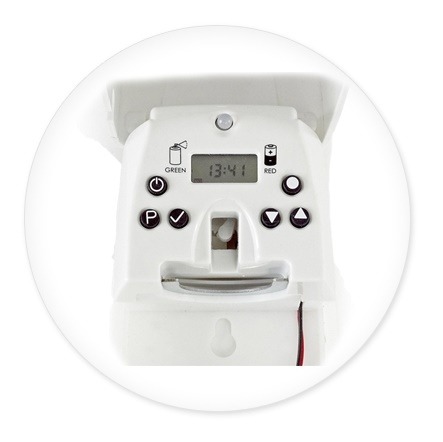 Dávkovač vůní v moderním provedení. Jednoduchá výměna náplně. Skrytý on/off spínač. Indikátor slabé baterie – červená LED dioda. Indikátor spotřebované náplně – zelená LED dioda. Výrobní nastavení provozu: 24 hodin, interval 15 minut, 7 dní. Kompletní flexibilita – start/stop provozu. Flexibilní nastavení intervalu dávkování 1 – 60 minut. Přesné nastavení dnů v provozu - například pouze PO - PÁ - od 8:00 . 18:00. Indikátor zbývajících dnů do spotřeby náplně. Vestavěné hodiny – režim 24 hodi. Možnost vysazení jednotlivých dnů z provozu. Skrytý spínač pro rychlý test provozu. Uzamykatelný kryt pomocí systémového klíče. Provoz na 2 C alkalické baterie LR14 ( nejsou součástí balení). Vhodné baterie naleznete pod kódem 9563.01 nebo 5407.01. Vhodné vůně do dávkovače naleznete pod kódy 6568.01, 4357.01 a 8201.01.